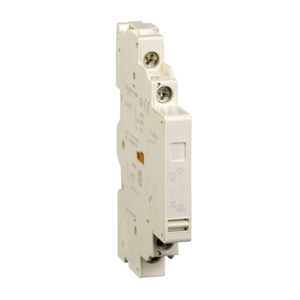 Contacto auxiliar Schneider Electric – Bloque auxiliar lateral con 1 contacto normalmente abierto (NA) y 1 normalmente cerrado (NC), con conexión por tornillo. Compatible con contactores y guardamotores TeSys GV2 y TeSys GV3.