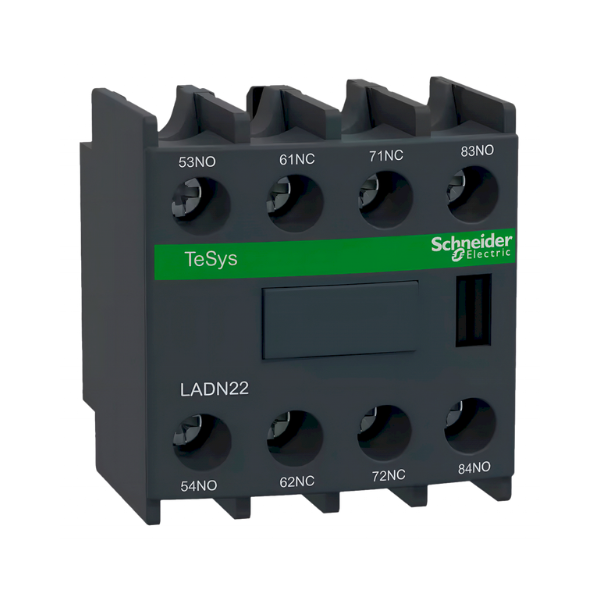 Bloque auxiliar con 2 contactos normalmente abiertos (NA) y 2 normalmente cerrados (NC), con conexión por tornillo. Compatible con contactores TeSys F y TeSys D.