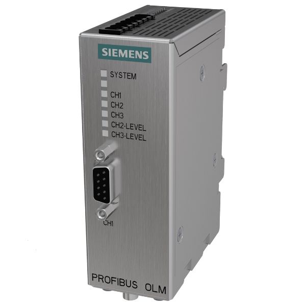 Módulo de enlace óptico PROFIBUS OLM/G12 V4.0 con 1 interfaz RS 485 y 2 interfaces de FO de vidrio (4 conectores hembra BFOC) para distancias estándar hasta 2850 m, con contacto de señalización y salida de medida