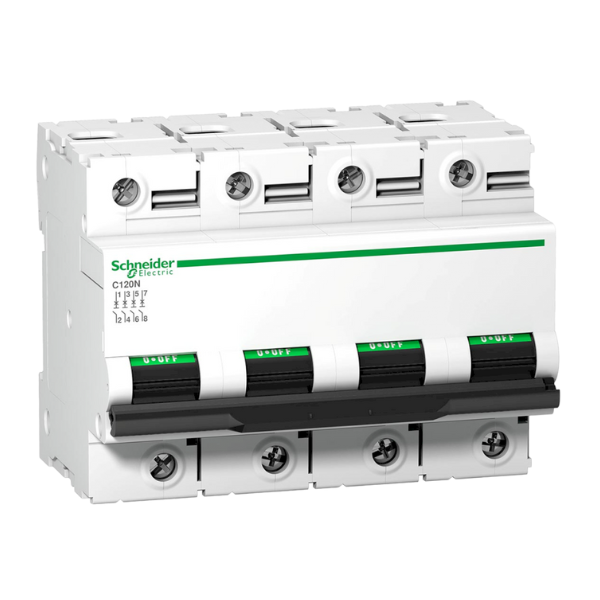 Termomagnética Schneider Electric – Interruptor termomagnético de 4 polos y 125A, curva D, con un poder de corte de 10kA. Opera a 380VCA o 125VCC por polo, brindando protección contra sobrecargas y cortocircuitos.