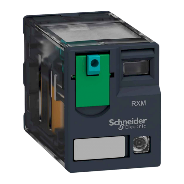 Relé Schneider Electric – Relé de interfaz diseñado para conmutación de circuitos. Este modelo Zelio opera con una tensión nominal de 24VCC y soporta una corriente nominal de 6A. Cuenta con 4 contactos de conmutación (4 C/O), lo que equivale a 4 NA/NC, e incluye un LED indicador de estado.